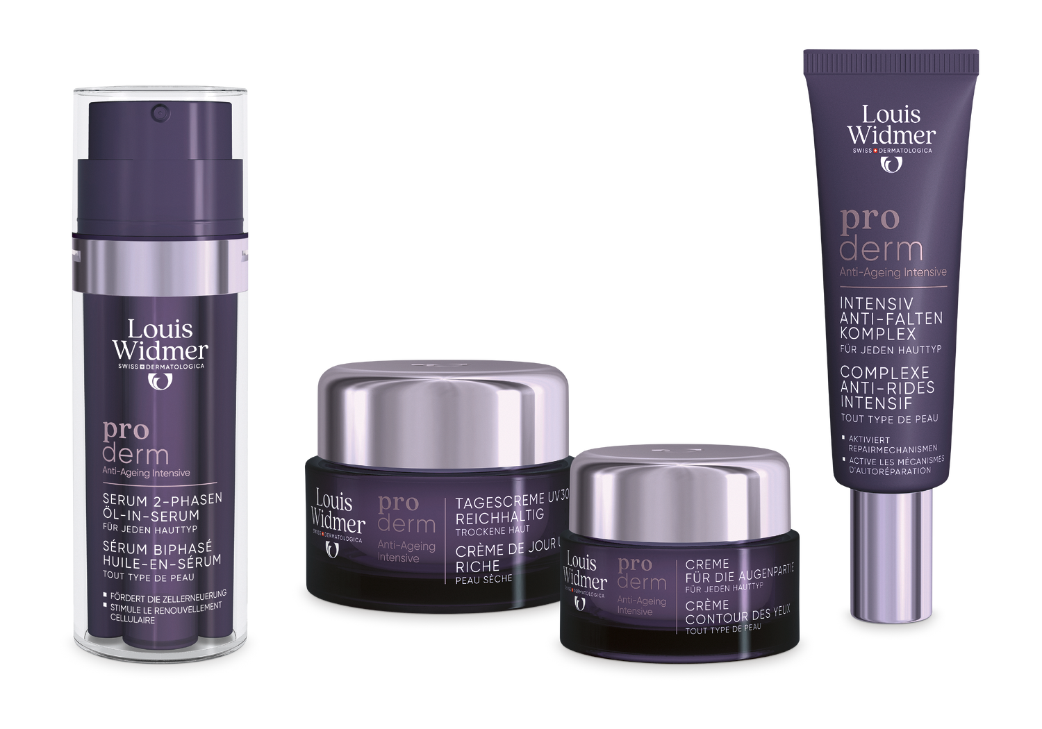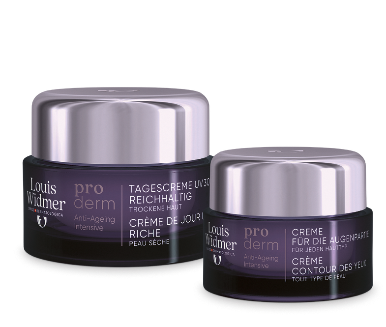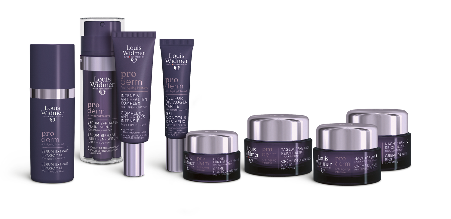 Tous les produits de la ligne proderm Sérum Extrait Liposomal, Biphasé Huile-en-Sérum, Complexe Anti-Rides Intensif, Gel Contour des Yeux, Crème Contour des Yeux, Crème de Jour UV 30 Riche, Crème de Nuit, Crème de Nuit Riche.